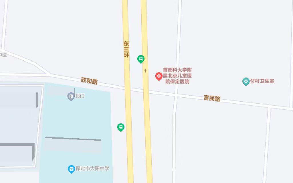 东院区公交路线:市内乘坐8路公交车北京儿童医院保定医院站下车。